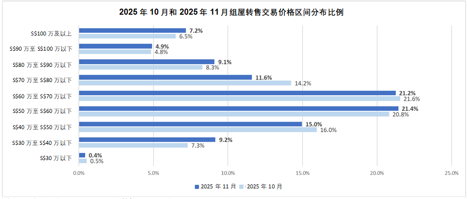 交易数据显示,11 月份成交价低于S$50 万的转售组屋占比为24.5%,略高于上个月的 23.8%。11 月份的交易中,约 42.7% 转售组屋售价在 S$50 万至 S$70 万之间,与 10 月份 42.4% 的比例基本持平。同时,11 月份转售价在 S$70 万至 S$100 万以下的组屋交易占比为 25.6%,低于上月的 27.4%。值得一提的是,转售价 S$100 万及以上的组屋交易占比,从 10 月份的 6.5% 上升至 11 月份的 7.2%(见图 2)。