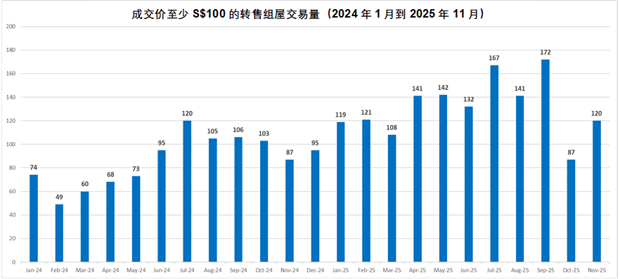 2025 年首 11 个月内售出的百万转售组屋销量共计 1,450 个单位,比 2024 年全年售出的 1,035 个百万组屋高出了 40%。