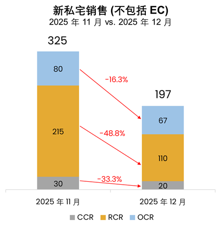 2026 年 1 月 15 日,新加坡——受新项目推出数量有限以及年底季节性淡季影响,12 月份房地产发展商销量下跌至近两年来最低,仅售出 197 个新单位(不包括执行共管公寓 Executive Condominium,简称 EC)。这是自 2024 年 2 月份售出 153 个单位以来,新私宅月销量最低的一次。12 月的发展商销量比 11 月份售出的 325 个单位环比减少了 39%。与去年 12 月成交的 203 个单位相比,2025 年12 月销量同比下滑3%。