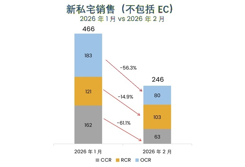 2026年3 月16日,新加坡 —— 农历新年假期没有新盘项目上市,2 月份新私宅销售表现疲软。房地产发展商于 2 月份共售出 246 个新私宅(不包括执行共管公寓 Executive Condominiums,简称 EC),比 1 月份售出的 466 个单位减少了 47%。与去年 2 月份 1,597 个单位的销量相比,销量同比下降 85%。2026 年首两个月内的新私宅销量共计为 712 个单位(不包括 EC)。