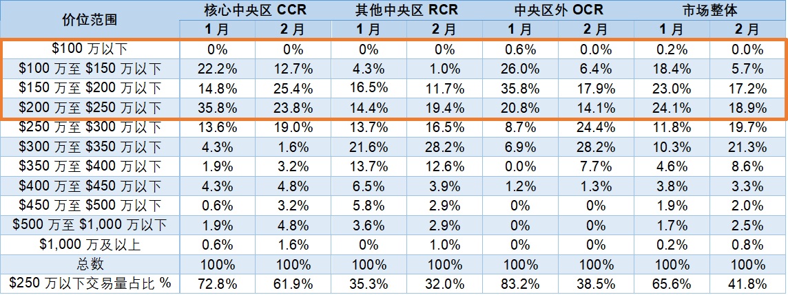 我们注意到,尽管2月份没有新楼盘推出,但 CCR 成交价低于S$250万的交易量占比仍然高达62%。S$250 万以下的房价是目前许多购房者的理想价位。这或许表明CCR 房子依旧具备一定的可负担性,价格有竞争性的黄金地段住宅需求稳定,且发展商正根据当前买家的购房能力水平调整其品项和定价策略。
